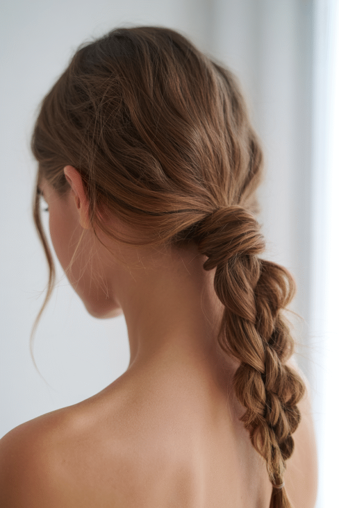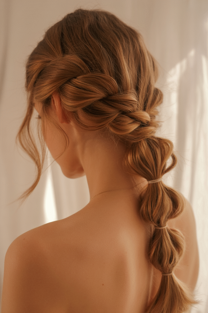 Add a romantic flair with a twisted ponytail. Divide your hair into two sections, twist them around each other, and secure with a tie. Pull a few strands out for a soft, feminine touch.