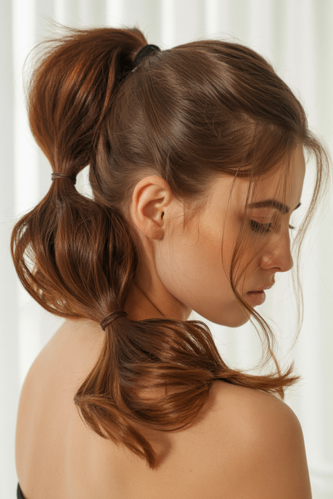 Create the illusion of thicker, longer hair by stacking two ponytails — one high, one low. This clever trick adds instant volume and bounce.