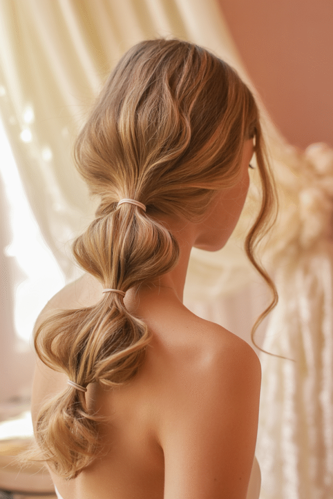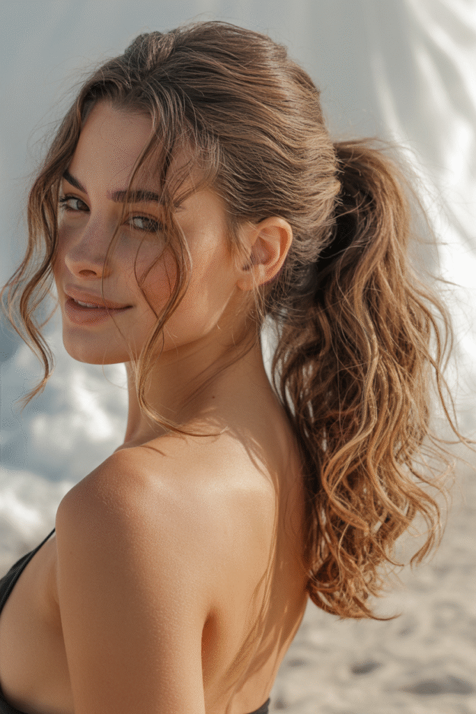 Enhance natural waves with a loose ponytail tied at mid-length. Use texturizing spray for beachy vibes that scream carefree elegance.