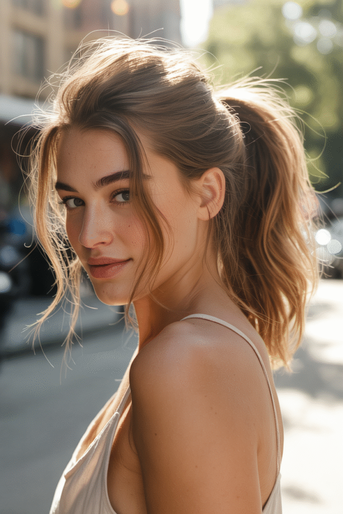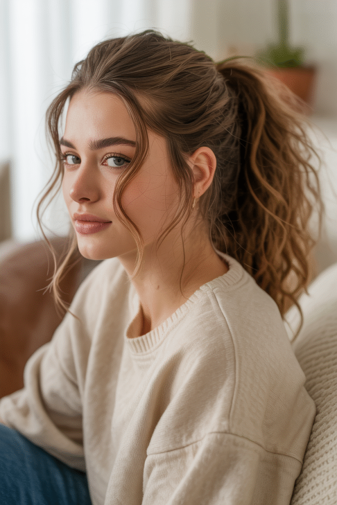 For effortless beauty, go for a messy ponytail. Tease the crown, pull your hair loosely back, and let some strands frame your face. It’s the ultimate lazy-day yet chic look.