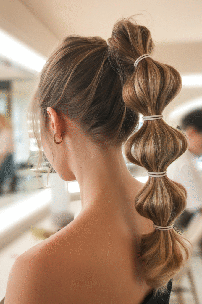 This trendy ponytail is all over Instagram. Secure your ponytail with multiple elastics spaced evenly apart, then gently pull each section to create a “bubble” effect — cute and playful!