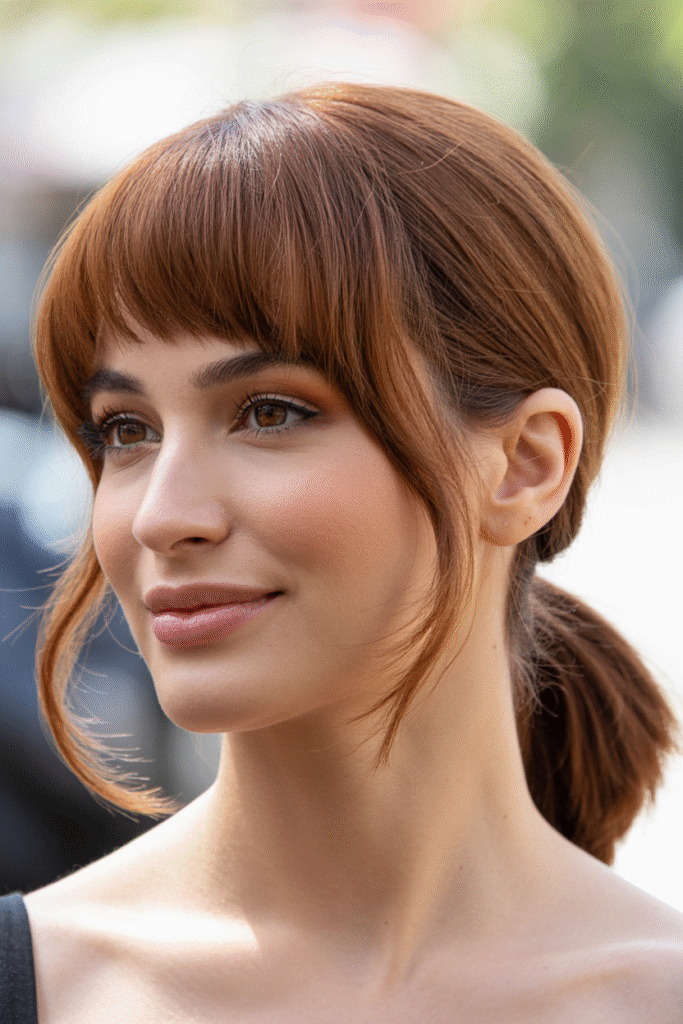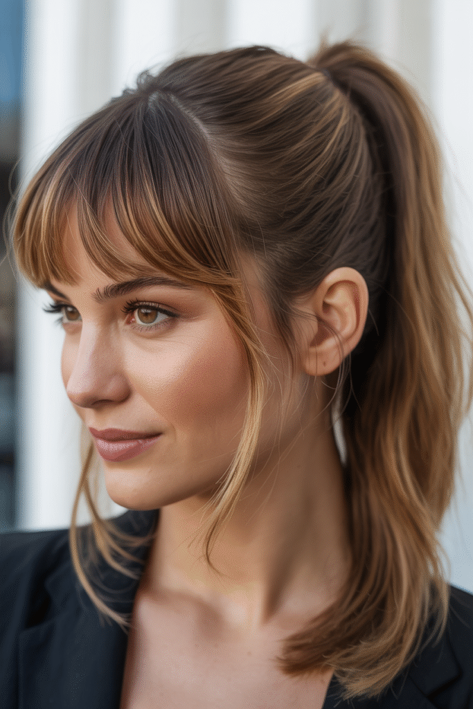 Combine bangs with a ponytail for a soft, face-framing effect. Curtain bangs or blunt fringes pair beautifully with this style, balancing edge and sweetness.