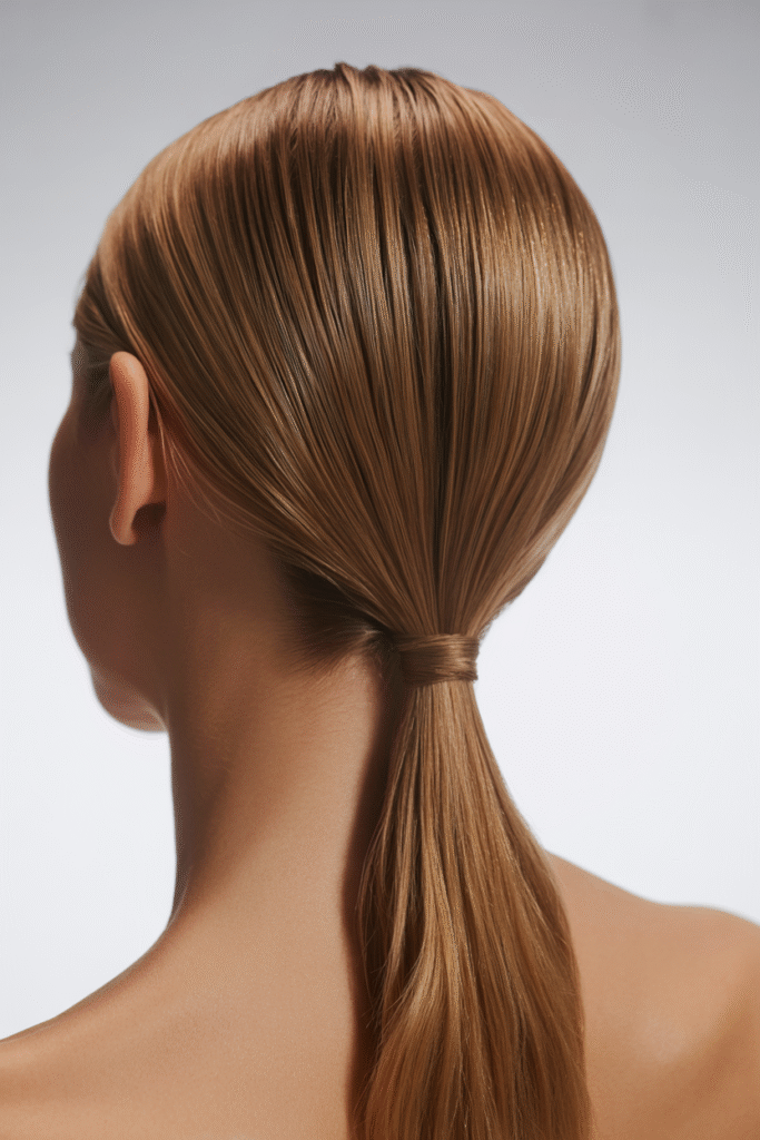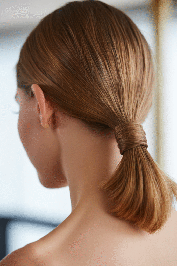 For a sophisticated touch, wrap a small section of your hair around the elastic band. This sleek and simple low ponytail is perfect for professional settings or elegant dinners.