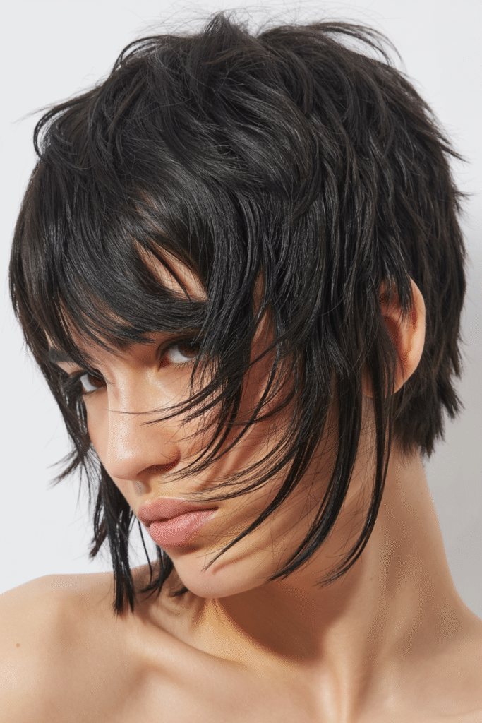 Go bold with a shaggy short wolf cut in jet black. The tousled texture adds movement, while curtain bangs soften the overall edge. Perfect for those who love statement styles with minimal styling effort.