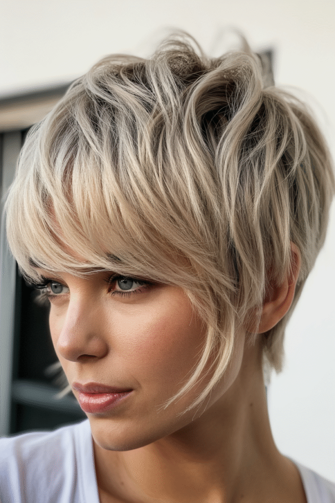 This messy-textured look screams carefree confidence. With tousled blonde strands and soft bangs, it’s a low-maintenance cut that looks effortlessly put together — even when it’s not.
