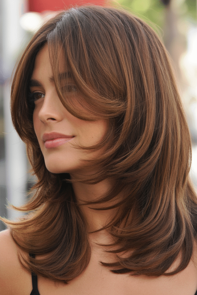 A classic brunette wolf cut never goes out of style. The medium length and face-framing bangs give a polished yet relaxed vibe — perfect for work, brunch, or date nights.