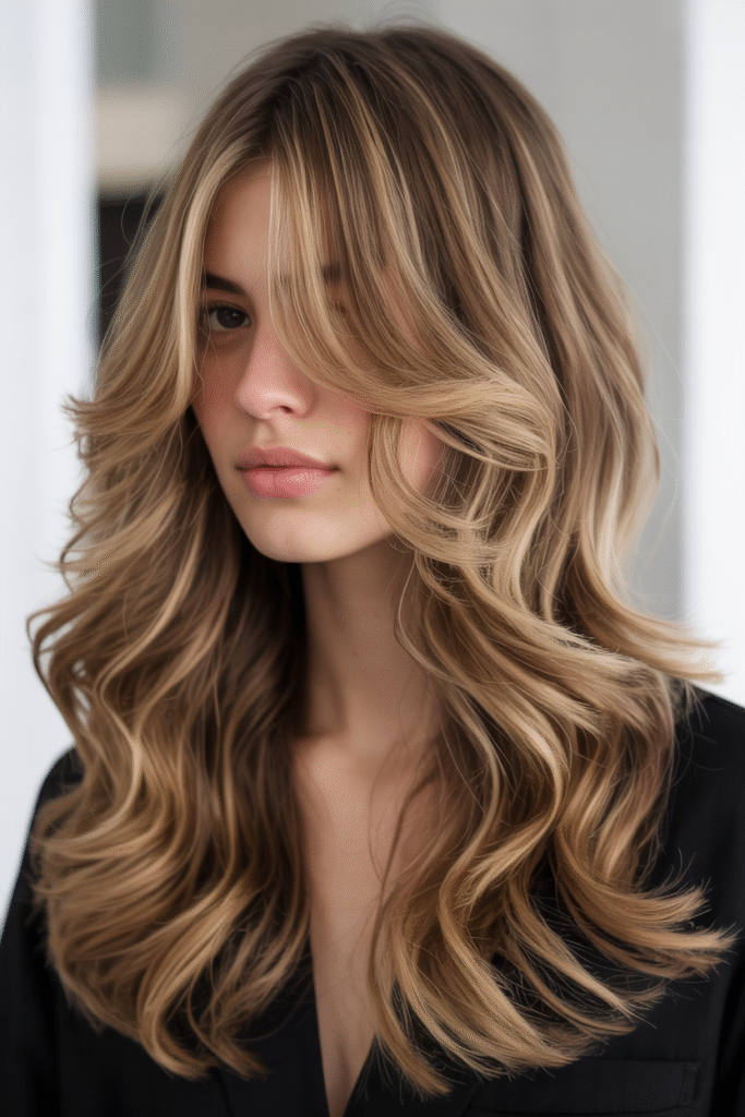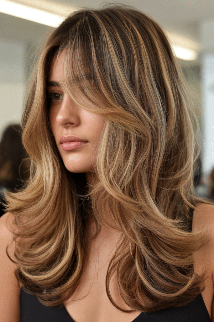 The octopus wolf cut adds extra layers and dimension to long hair. Paired with balayage highlights and flowing curtain bangs, this look blends structure and softness beautifully — especially for wavy or thick hair.
