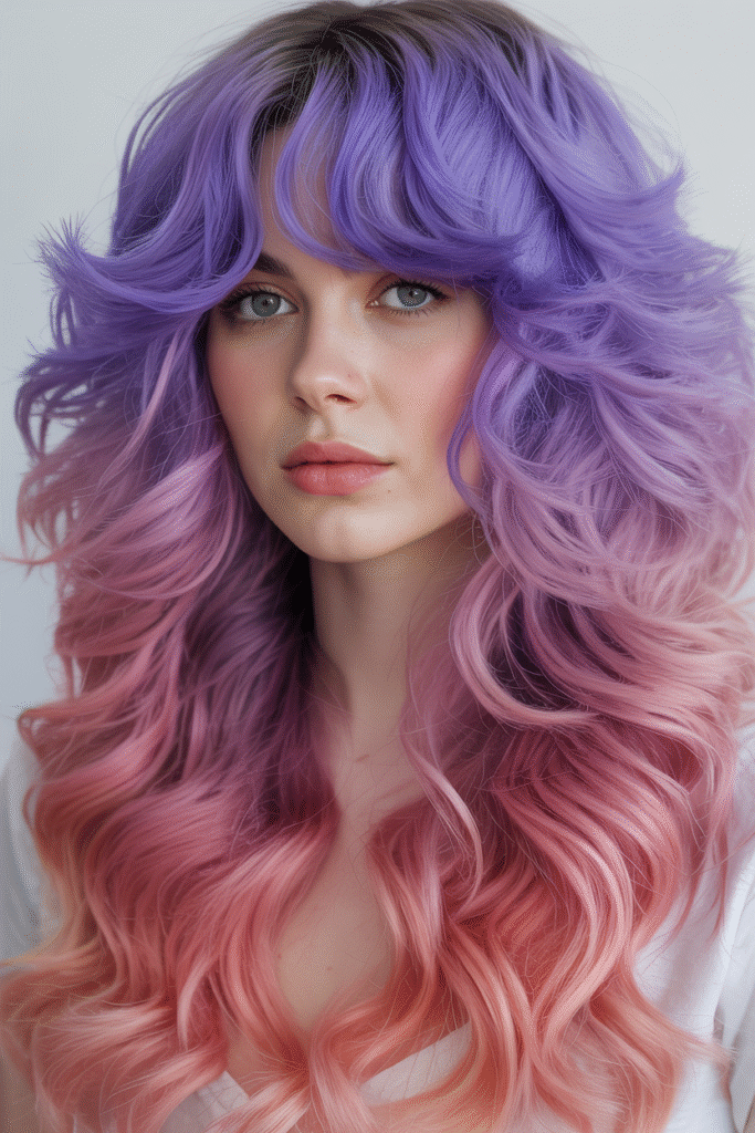 11. Purple Pink Long Wavy Wolf Cut With Curtain Bangs
