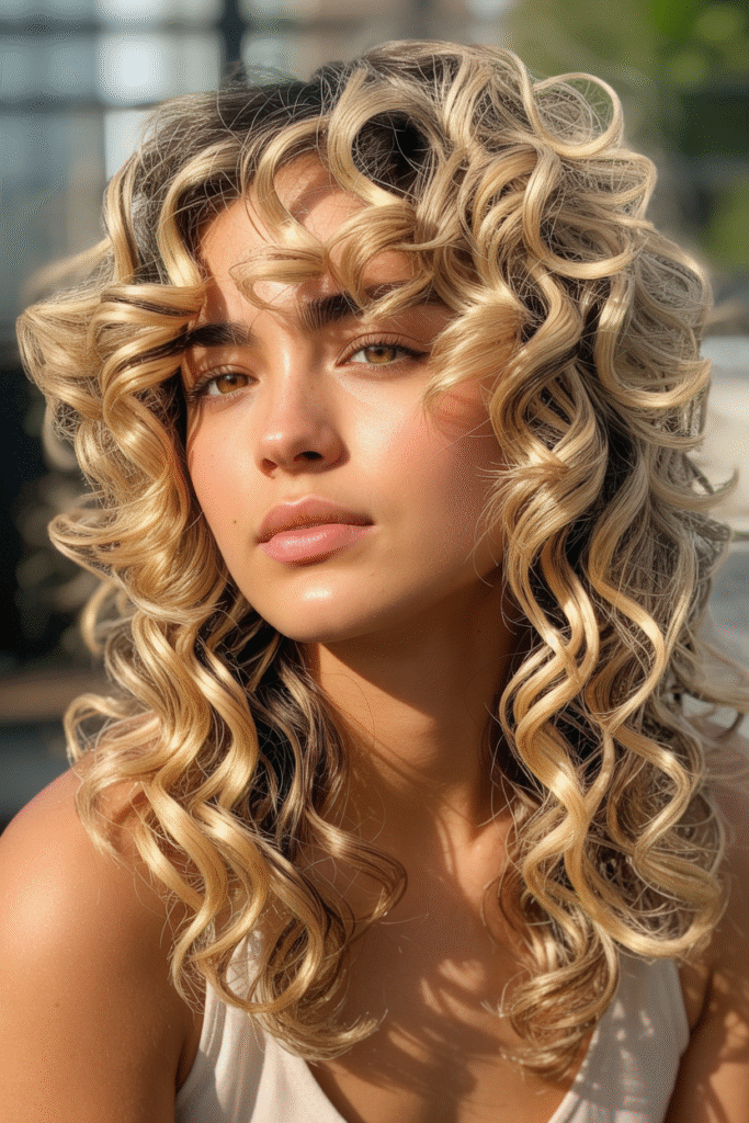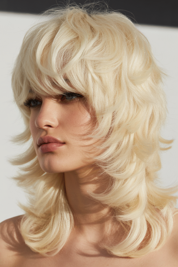 A voluminous wolf cut on bleached blonde hair offers that iconic ’70s rock star vibe. Use a round brush and volumizing mousse to achieve fluffy, airy layers that bounce with every move.