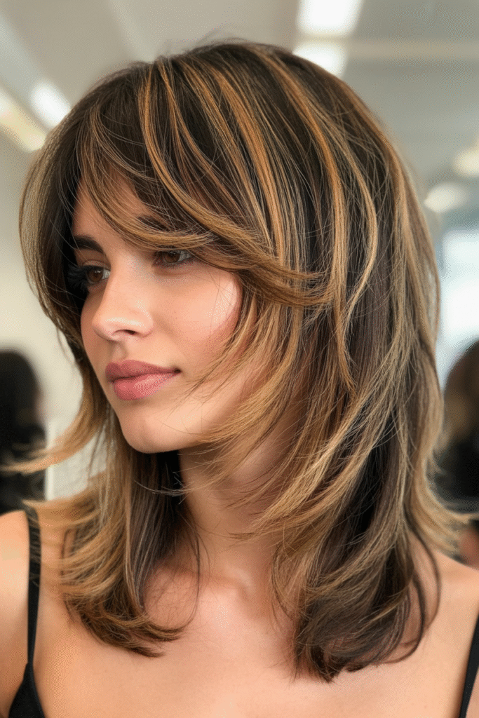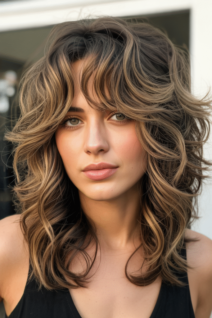 Balayage highlights add dimension to a medium-length wolf cut. The result? A radiant, multi-tonal hairstyle that looks sun-lit and natural. Curtain bangs tie it all together with softness and symmetry.