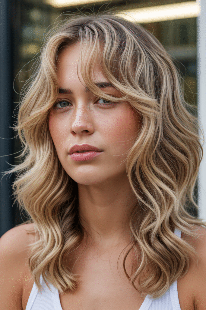 Add waves and bottleneck bangs to your medium wolf cut for a lived-in, beachy effect. This style looks amazing on sun-kissed blonde tones and gives off major California cool girl energy.