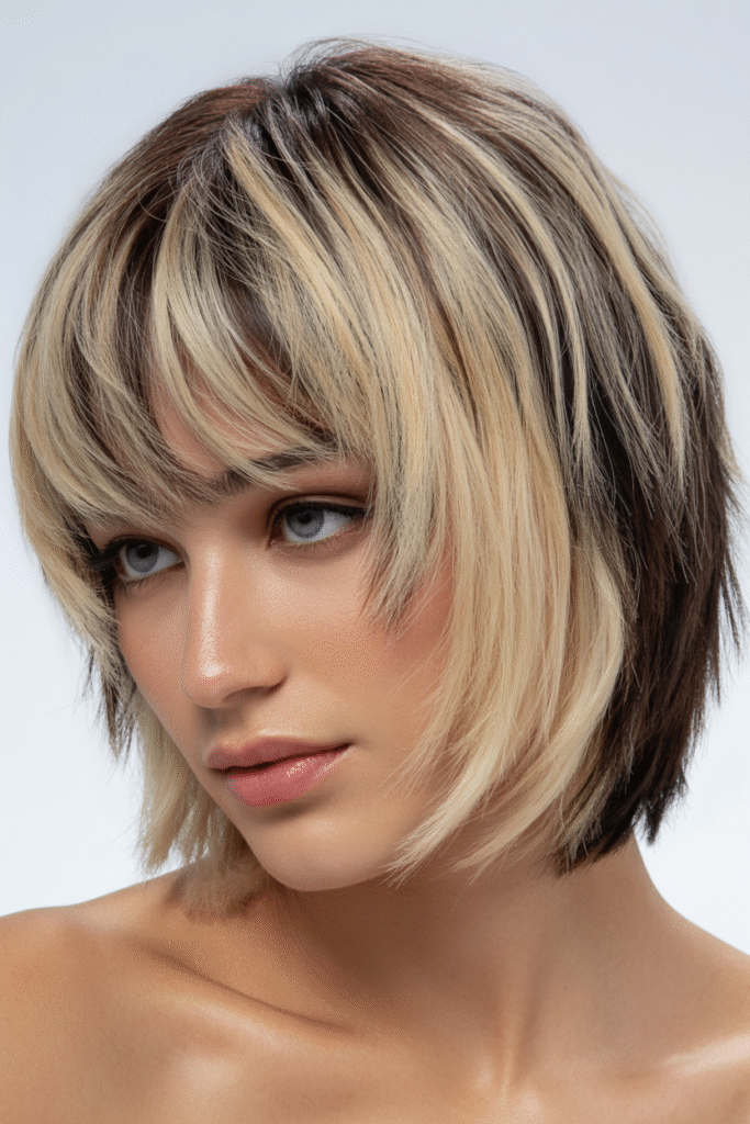 Two-tone coloring — like ash brown and platinum — takes the classic bob wolf cut to another level. The contrast between shades enhances the choppy layers and gives your face-framing bangs extra depth.