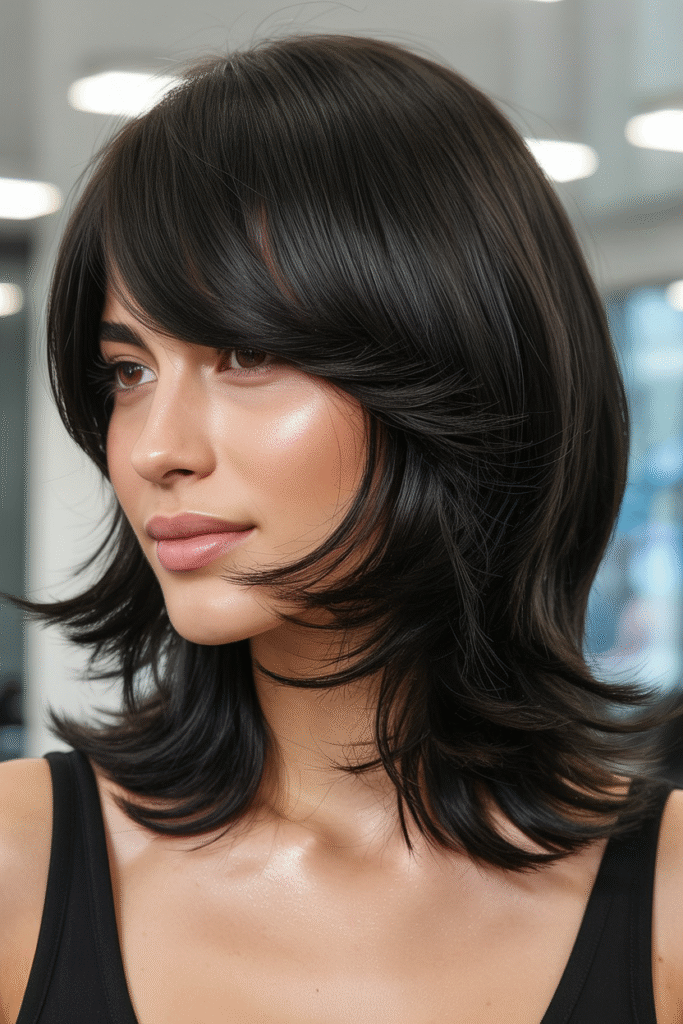 This timeless look combines glossy black tones with a mid-length wolf cut that gives volume and texture. The soft curtain bangs balance the sharp layers, making it ideal for oval and heart-shaped faces. Add a bit of shine spray for that salon-fresh finish.