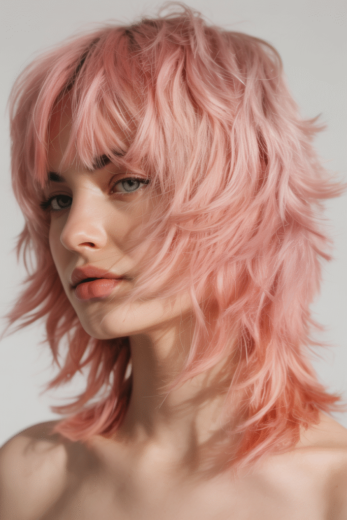 Turn heads with pastel pink tones and a shaggy wolf cut. The curtain bangs enhance the playful yet edgy aesthetic, making it a top choice for trend-setters who love bold color.