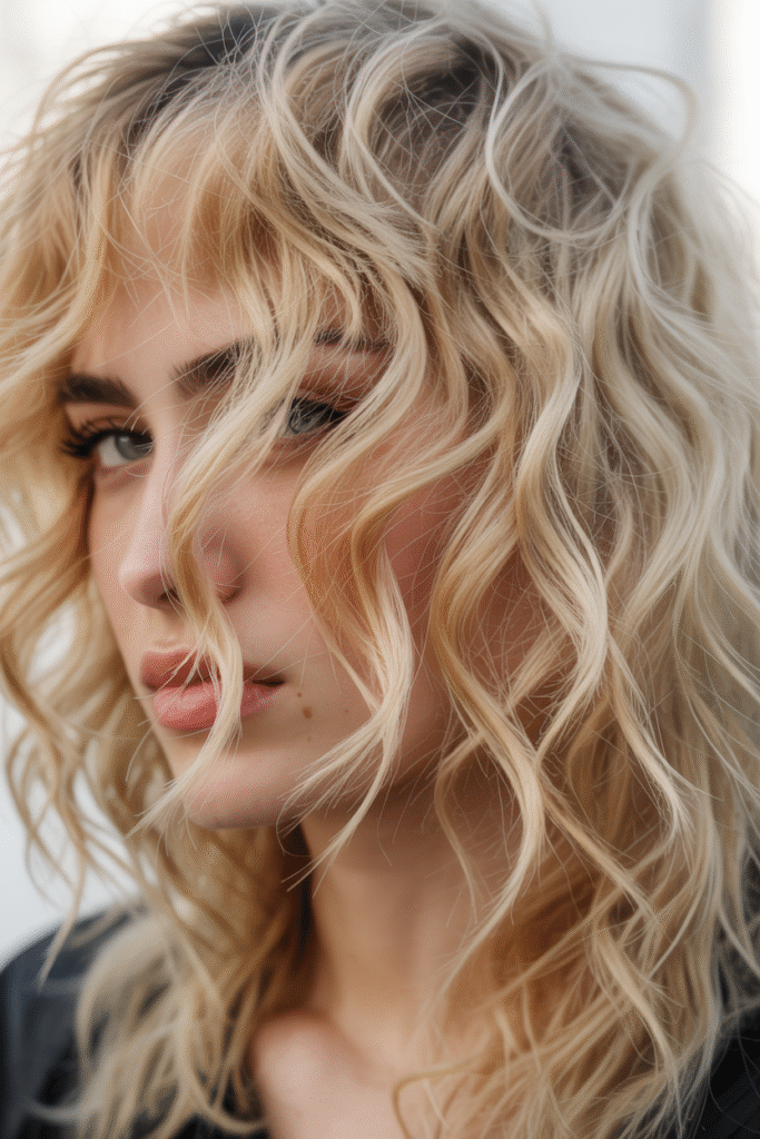 7. Long Wavy Blonde Wolf Cut With Wavy Random Bangs