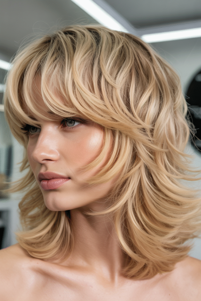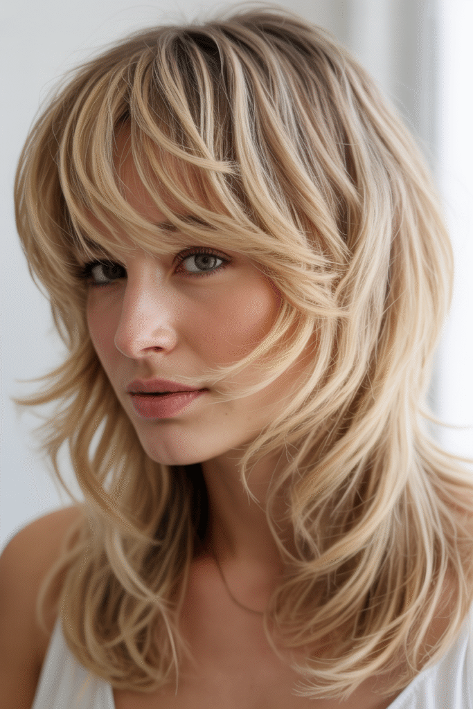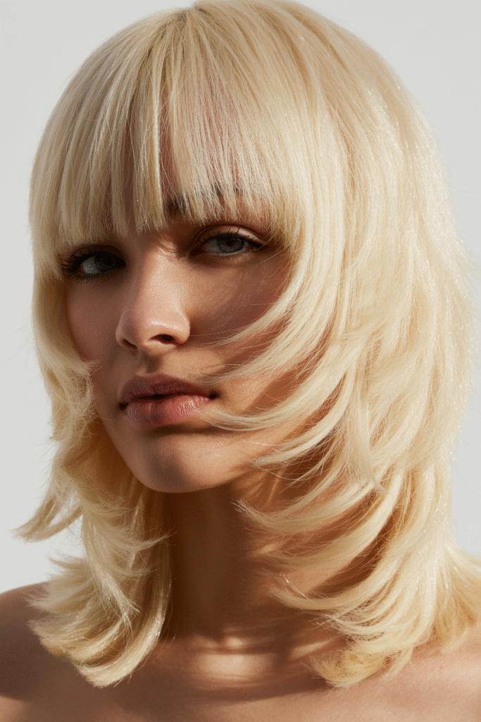 Soft choppy bangs add just the right amount of edge to this medium-length blonde wolf cut. It’s easy to style, full of volume, and flattering for round, oval, and heart-shaped faces — a timeless 2026 salon favorite.