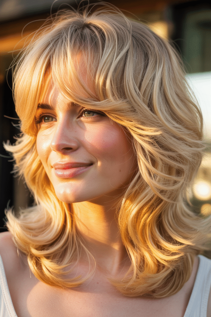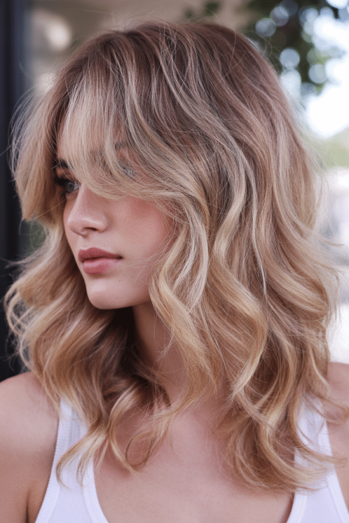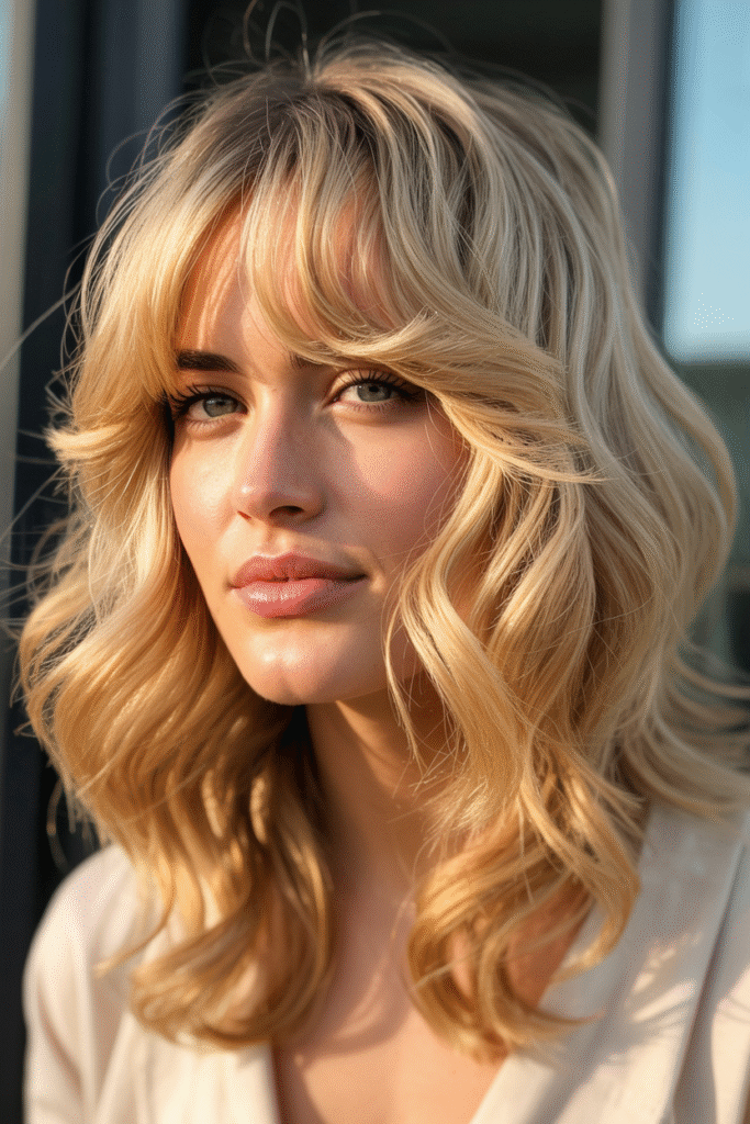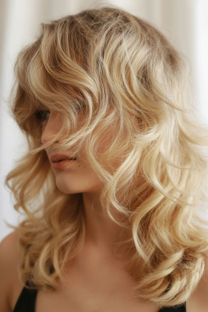 This wavy medium blonde wolf cut combines brown-pink undertones with soft blonde tones for a multidimensional look. The curtain bangs balance the waves, creating a romantic, effortless style that’s trending all over Pinterest in 2026.