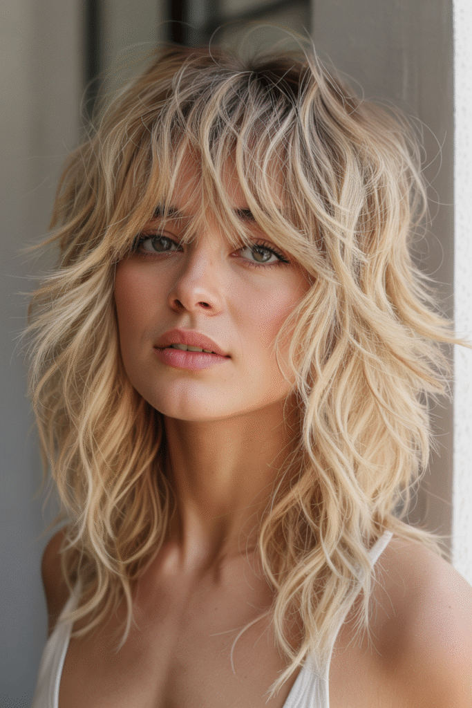 6. Tousled Wavy Medium Blonde Wolf Cut With Messy Bangs