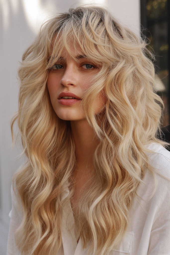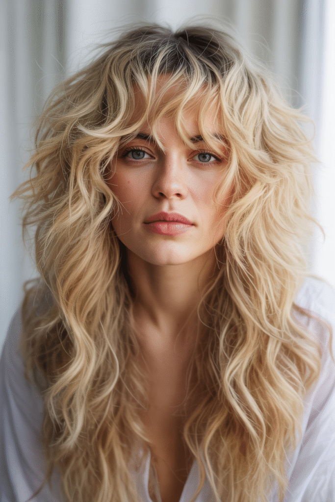 13. Long Blonde Wavy Wolf Cut With Extended Bangs